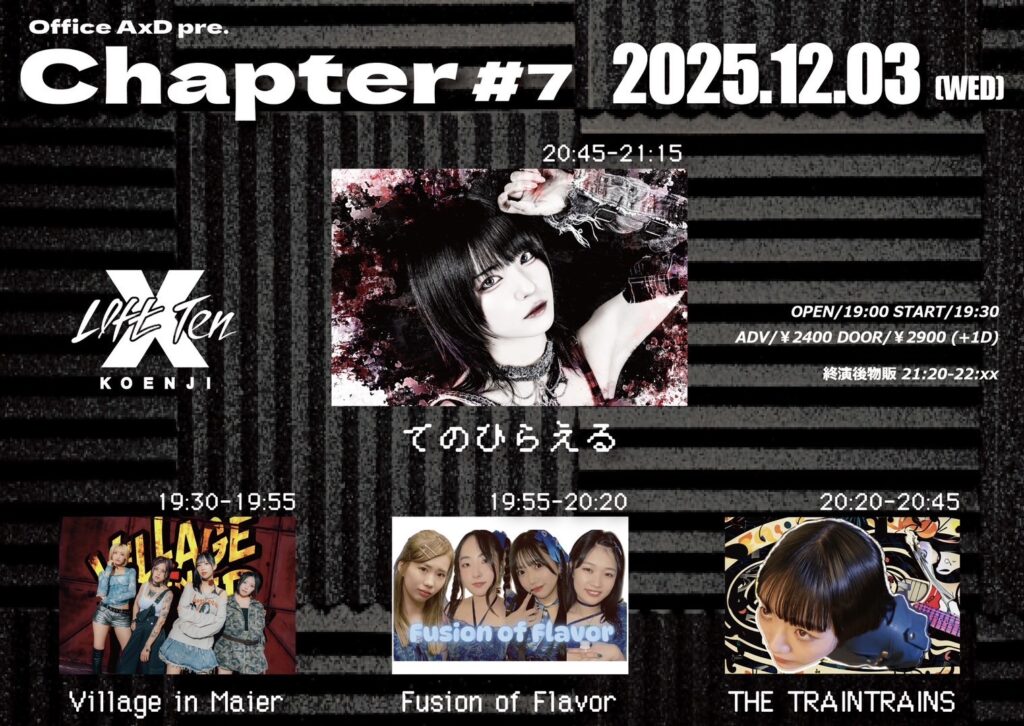 Office A×D pre.『Chapter #7』 2025年12月3日(水) 新高円寺LOFT X OPEN/19:00 START/19:30 出演 THE TRAINTRAINS (20:20~20:25) てのひらえる Fusion of Flavor Village in Maier ADV/¥2400(+1D) DOOR/¥2900(+1D)チケット予約▷https://t-dv.com/chapter_7 -
