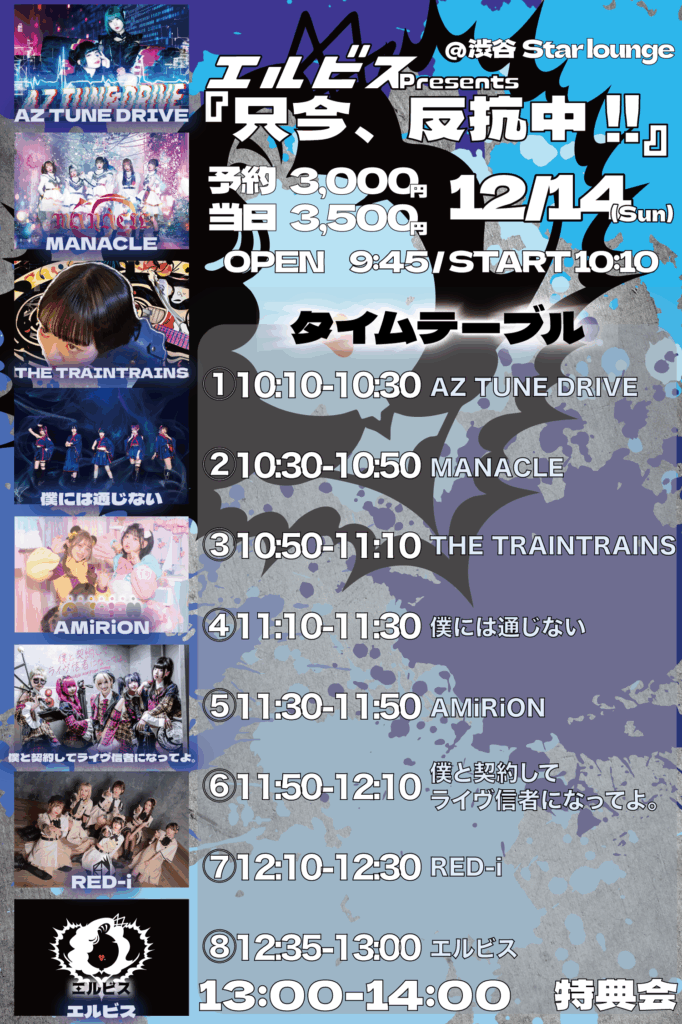 エルビスPresents. 『只今、反抗中!!』 2025年12月14日(日) 渋谷Star lounge OPEN/9:45 START/10:10 出演 THE TRAINTRAINS (10:50~11:10) エルビス 僕と契約してライヴ信者になってよ。 僕には通じない AMiRiON AZ TUNE DRIVE MANACLE RED-i ADV/¥3000(+1... -